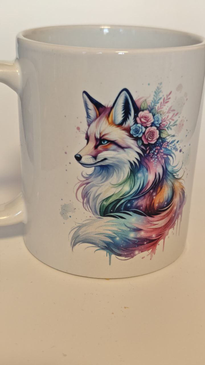 Ein eleganter, weißer Keramikbecher mit farbintensivem Regenbogen-Fuchs-Motiv im Aquarell-Look. Der Sublimationsdruck ist dauerhaft, kratzfest und ohne fühlbare Kanten – perfekt für Kaffee, Tee und Kakao.