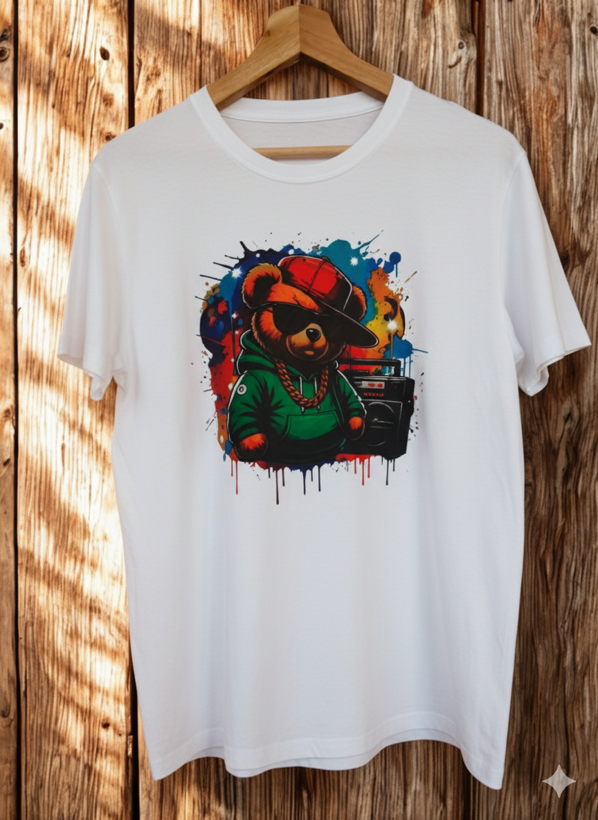 Dieses weiße Rundhals-Shirt setzt den Hip-Hop Bear in kräftigen Farben perfekt in Szene. Der langlebige Textildruck ist glatt (ohne spürbare Kanten), die 100 % Baumwolle sorgt für angenehmen Tragekomfort. Ideal für Streetwear, Festival, Freizeit – oder als besonderes Geschenk.