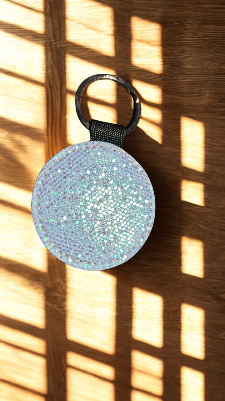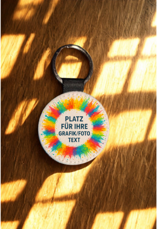 Klassischer runder Schlüsselanhänger mit individueller Druckfläche. Perfekt für Fotos, Namen oder kurze Sprüche. Dank der glänzenden Glitzer-Rückseite wird dieser Anhänger zum Highlight an jedem Schlüsselbund.