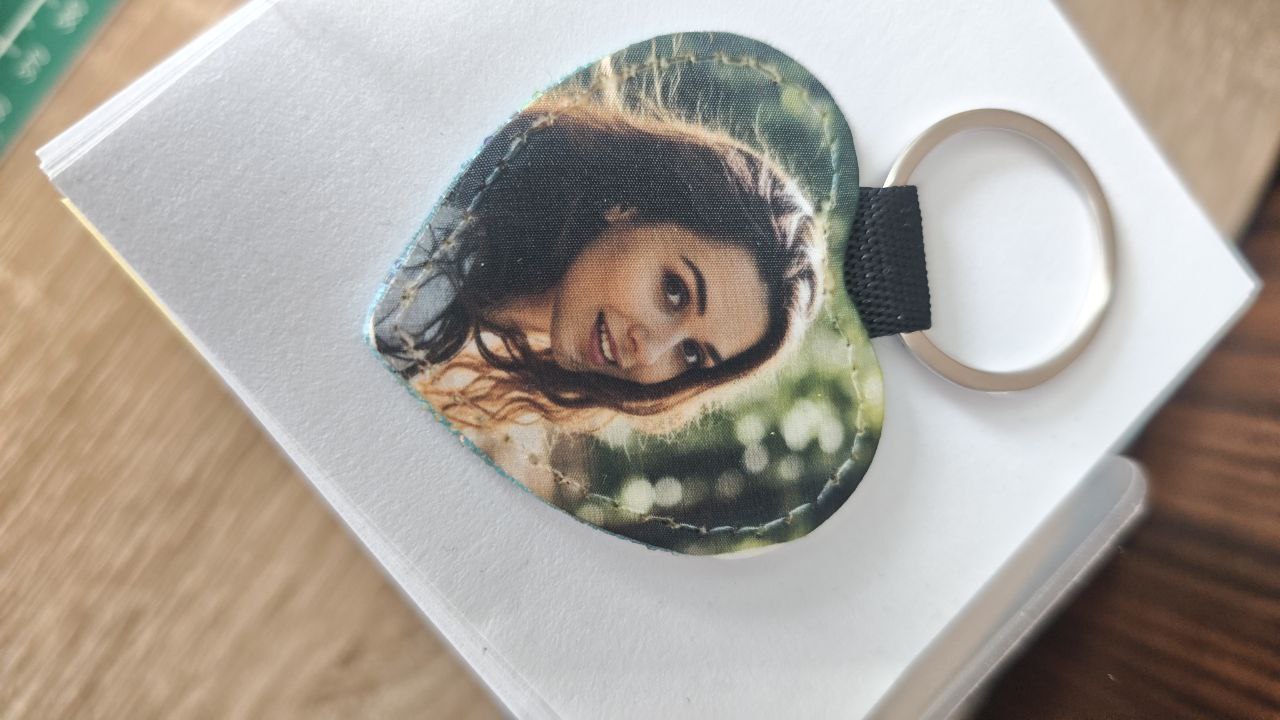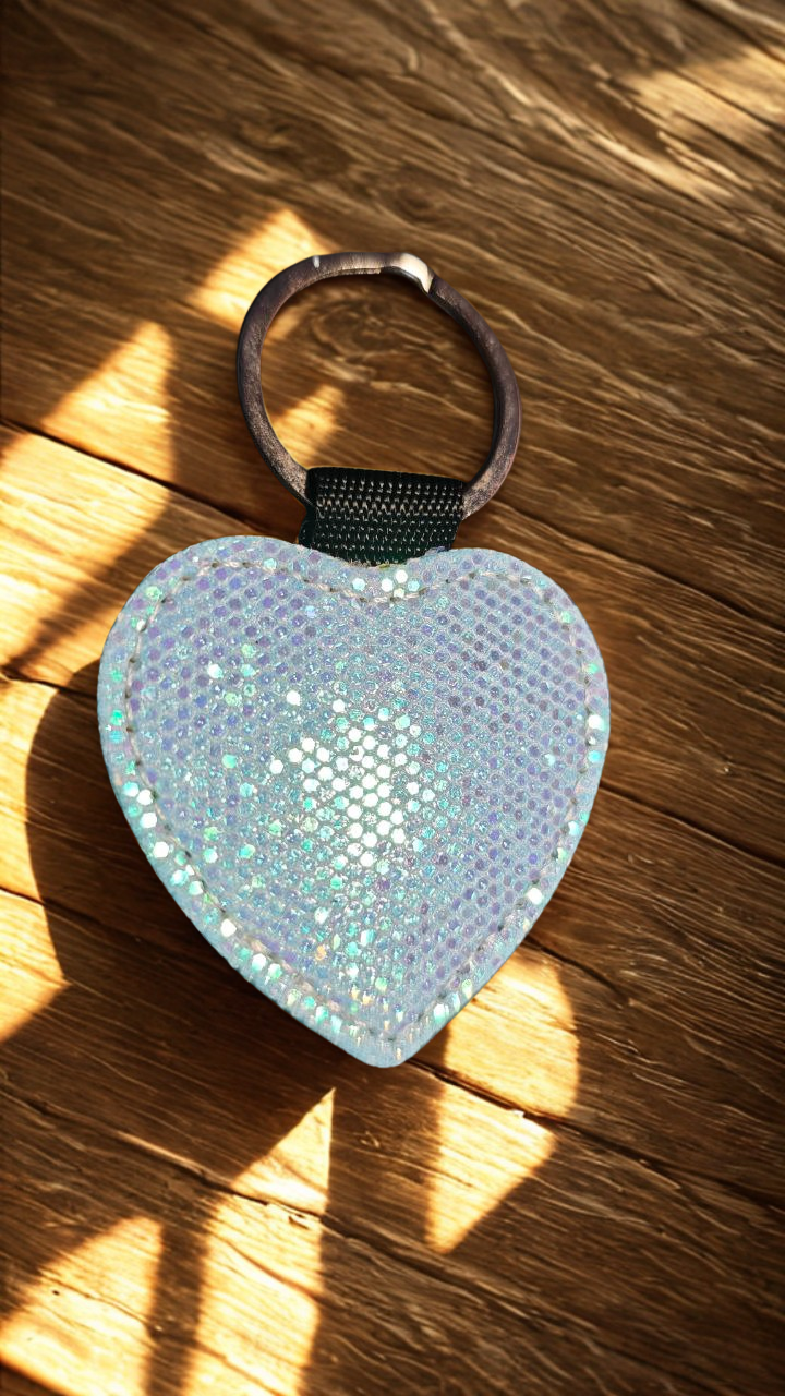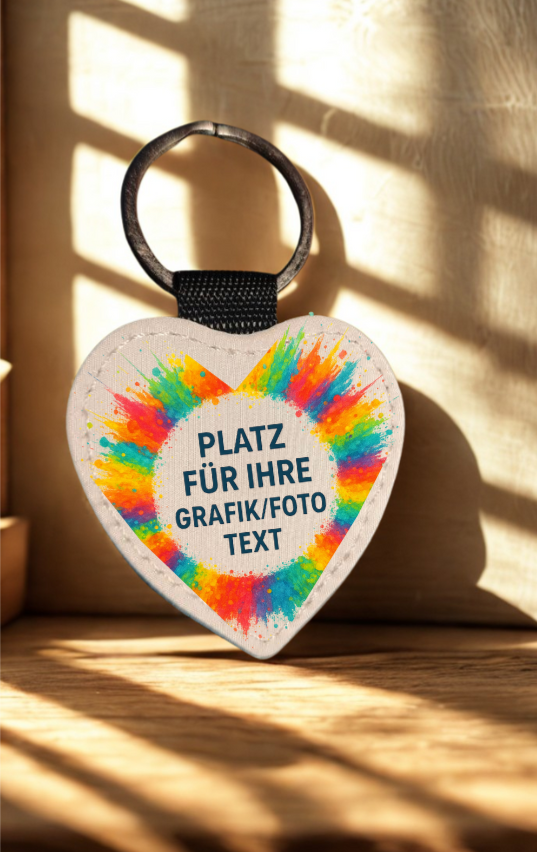 Romantischer Schlüsselanhänger in Herzform – das perfekte Geschenk für Verliebte, Familie oder Freunde. Auf der Vorderseite wird Ihr Wunschmotiv per Sublimationsdruck aufgebracht, die Rückseite funkelt in kräftigem Blau mit Glitzer.