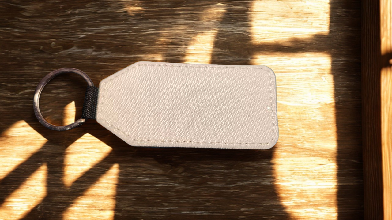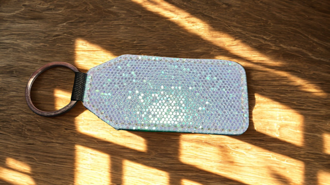 Moderner rechteckiger Schlüsselanhänger mit personalisierbarer Vorderseite. Die robuste Stoffoberfläche (Fabric) wird per Sublimation bedruckt und sorgt für brillante Farben und lange Haltbarkeit. Auf der Rückseite glänzt ein auffälliger blauer Glitzer – ein echter Hingucker an jedem Schlüsselbund.